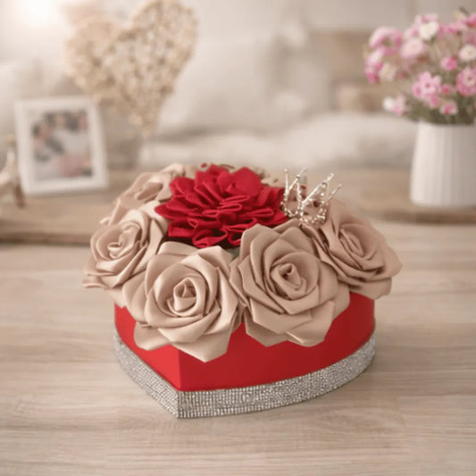 Boîte Cœur garnie " Roses en satin & Dahlia"
