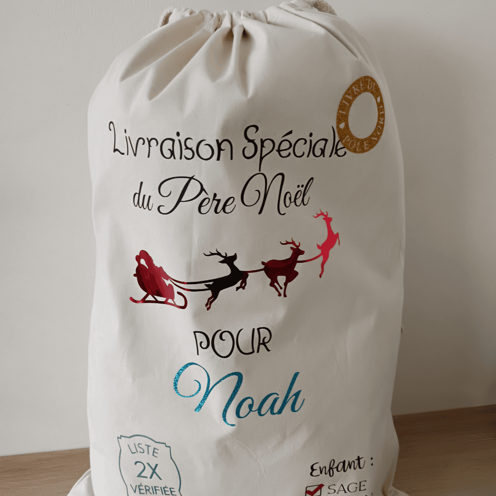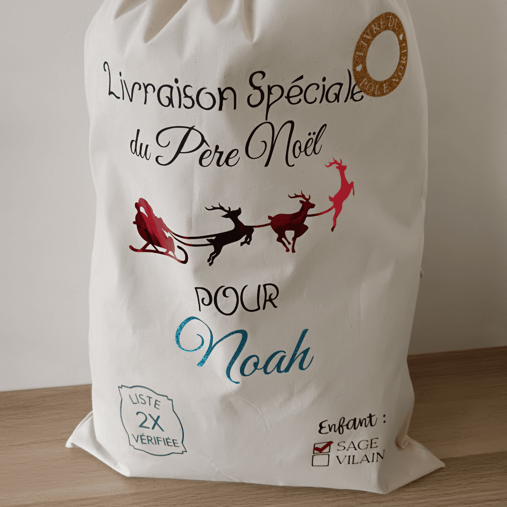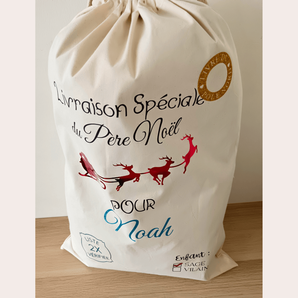 Ce pochon unique est décoré avec des illustrations féeriques : traîneau, lutins, cachet de la poste, liste vérifiée deux fois, et même le rappel amusant “enfant vilain ou sage”. Le texte “Livraison spéciale du Père Noël pour” ajoute une touche magique et personnalisée à chaque hotte.