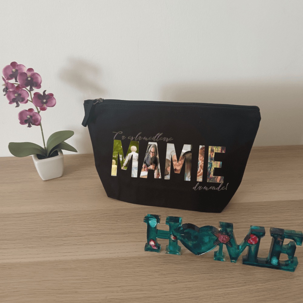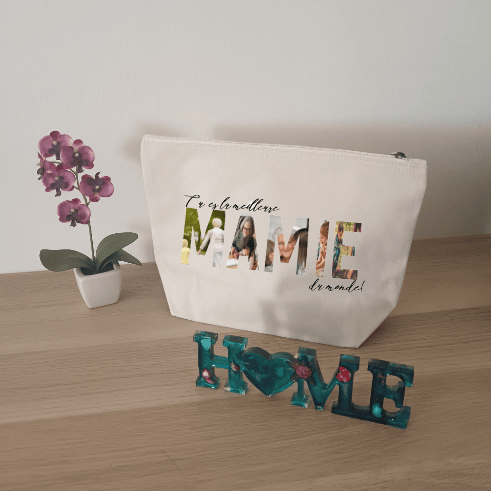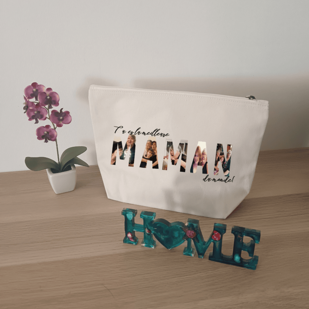 Offrez un cadeau unique et plein d’émotions 🌟 ! Cette pochette est bien plus qu’un accessoire : c’est un souvenir personnalisé, décoré avec vos plus belles photos 📸. Les mots "Maman", "Mamie" ou "Tata" sont composés de plusieurs images, une par lettre, pour créer un design touchant et inoubliable 🧡.