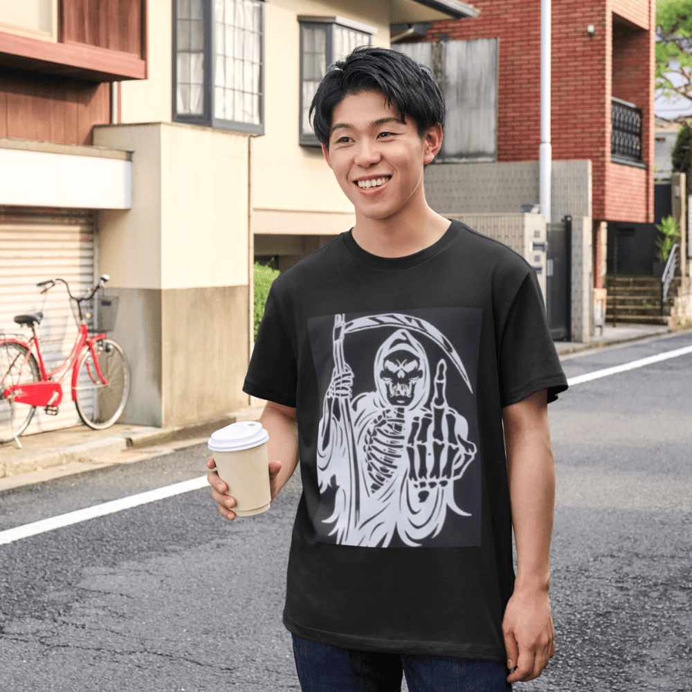 Affirmez votre style avec ce tee-shirt noir à manches courtes, conçu pour ceux qui aiment les designs audacieux et provocateurs. Son motif saisissant représente une faucheuse squelettique vêtue d'une cape, brandissant sa faux tout en faisant un doigt d'honneur.